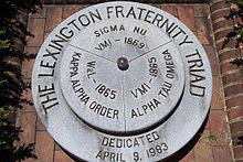 Members of the triad include Alpha Tau Omega (founded in Richmond, Virginia in 1865 by students from Virginia Military Institute (VMI) in Lexington), Kappa Alpha Order (founded in 1865 at Washington and Lee University and not to be confused with the Kappa Alpha Society), and Sigma Nu (founded in 1869 at VMI). The national headquarters of both the Kappa Alpha Order and Sigma Nu are located in Lexington.