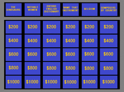 Three contestants each take their place behind a lectern, with the returning champion occupying the leftmost lectern (from the viewer's perspective). The contestants compete in a quiz game comprising three rounds: Jeopardy!, Double Jeopardy!, and Final Jeopardy!.[4] The material for the questions covers a wide variety of topics, including history and current events, the sciences, the arts, popular culture, literature, and languages.[5] Category titles often feature puns, wordplay, or shared themes, and the host will regularly remind contestants of topics or place emphasis on category themes before the start of the round.