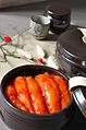 Solid jeotgal are usually eaten as banchan (side dishes). Liquid jeotgal, called aekjeot (액젓) or fish sauce, is popularly used in kimchi seasoning, as well as in various soups and stews (guk, jijimi, jjigae).[4] As a condiment, jeotgal with smaller bits of solid ingredients such as saeu-jeot (shrimp jeotgal) is commonly served as a dipping sauce with pork dishes (bossam, jokbal, samgyeopsal), sundae (Korean sausage), hoe (raw fish), and a number of soups and stews.