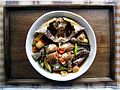 Jeotgal (젓갈) or jeot (젓), translated as salted seafood, is a category of salted preserved dishes made with seafood such as shrimps, oysters, clams, fish, and roe.[1][2][3] Depending on the ingredients, jeotgal can range from flabby, solid pieces to clear, broth-like liquid.