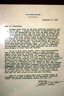 However, his stint as press secretary lasted only a month, from August 9 to September 8, 1974. He resigned in protest in the wake of President Ford's announcement that he would pardon former president Richard Nixon for any possible crimes connected with the Watergate scandal, Ford saying—as paraphrased by The New York Times[2]—that "to pursue criminal charges against the former president would be detrimental to the interests of the country".[2] At the time, the story that circulated was that terHorst had resigned because he had been blindsided by Ford's decision and because he had consistently denied to reporters in his daily press briefings that Ford had any intent of pardoning Nixon. Once the pardon was issued, the story went, terHorst felt that any credibility that he had earned with reporters had been undermined. Therefore, he handed in his resignation even before Ford went on the air.[4]