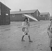 Jerome was divided into 50 blocks, which were surrounded by a barbed wire fence, a patrol road, and seven watchtowers. Administrative and community spaces such as schools, offices and the hospital were separate from the 36 residential or barracks blocks. These consisted of twelve barracks divided into several "apartments", in addition to communal dining and sanitary facilities. Approximately 250 to 300 individuals lived in each block.[2] The only entrances were from the main highway on the west and at the back of the camp to the east. The camp was not finished when its first inmates began to arrive from California assembly centers. These early arrivals were forced to work on construction of their incarceration quarters.[2]