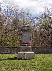 Reno had a reputation as a "soldier's soldier" and often was right beside his troops without a sword or any sign of rank.[9] On September 12, 1862, Reno's IX Corps spent the day in Frederick, Maryland, as the Army of the Potomac under Maj. Gen. George McClellan advanced westward in pursuit of the Confederate Army of Northern Virginia under Gen. Robert E. Lee. Elements of Lee's army defended three low-lying "gaps" of South Mountain—Crampton's, Turner's, and Fox's—while concentrating at Sharpsburg, Maryland, to the west, the location of the subsequent Battle of Antietam (September 17, 1862). In the Battle of South Mountain on September 14, Reno stopped directly in front of his troops as he reconnoitered the enemy's forces advancing up the road at Fox's Gap. He was shot in the chest by a rookie Union Soldier from the 35th Massachusetts who mistook him for Rebel Cavalry at dusk.[10] The manuscript of Union Officer Ezra A. Carman, published in The Maryland Campaign of September 1862, Vol. 1: South Mountain, Edited and annotated by Thomas G. Clemens, ISBN 978-1-932714-81-4, document Jesse's death by men of General John Bell Hood who were in and fired from the woods that the 35th Massachusetts skirmishes had just retreated from.