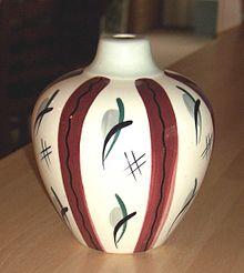 Midwinter produced a series of Jessie Tait vases and beakers with tube-lined decoration. Tait also worked at home in the evenings, making intricate tube-lined wares on terracotta bodies for friends and family. She also designed for the Clayburn Pottery.