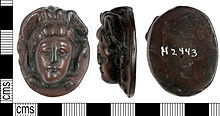 Whitby jet was a popular material for jewellery in Roman Britain from the 3rd century onward.There is no evidence for Roman jet working in Whitby itself,[24] rather it was transferred to Eboracum (modern York) where considerable evidence for jet production has been found.[29] The collection of jet at this time was based on beachcombing rather than quarrying.[24] It was used in rings, hair pins, beads, bracelets, bangles, necklaces, and pendants,[24] many of which are visible in the Yorkshire Museum. Jet rings tended to follow the styles of existing metal rings although there were exceptions.[30] Jet pendants were carved cameo style with Medusa head being a popular theme.[31]
