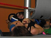 During Volume 20 the tag team picked up a victory over Ashley Lane and Nevaeh, sparking a feud between the two teams.[38] The feud heightened in October when Shimmer held a Tag team gauntlet to crown the inaugural Shimmer Tag Team Champions. After defeating The Suicide Blondes (LuFisto and Jennifer Blake), they lost their chance at being inaugural champions by being eliminated by eventual winners Lane and Nevaeh.[39] With the teams evenly matched at a fall each, and the new tag team belts deepening the feud, the two were announced to compete at Volume 23 in a two out of three falls match.[40] The Home Wrecking Crew scored the first fall when Lacey made a shocking return to wrestling after months of being absent and reversed a cradle pin behind the referee's back to help them win the first fall. When the referee tried to eject her she handed him a certified manager license and was allowed to stay at ringside but could not stop Lane from tying the score over Rain. The challengers got the third pinfall when Lacey threw a chain to Jetta and it appeared she had won the championships for the team. However, the match was restarted when the senior official notified the referee and in the end Lane and Nevaeh retained their titles when Nevaeh pinned Jetta.[41][42] Later in the night the team of Jetta and Rain defeated the team of Nikki Roxx and The Portuguese Princess Ariel. After two Volume of singles action, where Jetta lost to Tenille and defeated Daffney, Jetta and Rain defeated the teams of Rachel Summerlyn and Daffney and Jessie McKay and Tenille as part of Volumes 27 and 28.