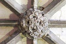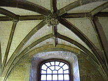 The ground floor of the tower is entered from the north, and is made up of two chambers, a larger room 7.5 by 4 metres (25 by 13 ft), a smaller turret room in the south-east corner, 4 by 3 metres (13.1 by 9.8 ft).[73] The windows in the main room are a mixture of early 18th-century designs, combined with a surviving large medieval window embrasure on the eastern side.[74] The main chamber has elaborate stone vaulting, considered by historian Jeremy Ashbee to be "one of the most impressive medieval interiors in London... an architectural masterpiece".[74] The vaulting features 16 carved Reigate stone bosses, including grotesque heads, birds, flowers and the devil, some designed to form amusing visual illusions.[75] The ground floor is used by English Heritage as a gift shop and cafe.[76]