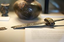 Archaeologists have recovered over 400 objects associated with the tower, and various Delftware drinking jars and an Iron Age sword are displayed inside, along with a set of historiated capitals, described by the historian Jeremy Ashbee as "important and rare examples of English Romanesque sculpture", originating from the Westminster Hall of the 1090s, and a set of weights and measures, on loan from the Science Museum.[66]