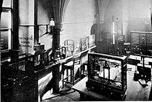 The house alongside the Jewel Tower was taken over by the new department in 1869, and the standards and testing equipment were installed in the tower itself, which was felt to be particularly suitable for making scientific measurements, because of its thick walls.[47] The roof, which was in poor condition, was repaired.[48] The ground floor was used as a weighing room and for storing glass fluid measures, the first floor held the standards of length, and the second floor was used as a museum to display old historical equipment.[48]