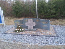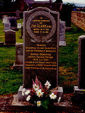 Clark is buried in the village of Chirnside in Berwickshire.[7] A memorial stone can be found at the Hockenheimring circuit, moved from the site of his crash to a location closer to the current track, and a life-size statue of him in racing overalls stands by the bridge over a small stream in the village of his birth, Kilmany in Fife. A small museum, which is known as The Jim Clark Room,[26] can be found in Duns.