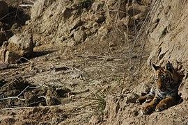 Bengal tigers, although plentiful, are not easily spotted due to the abundance of foliage - camouflage - in the reserve.[2] Thick jungle, the Ramganga river and plentiful prey make this reserve an ideal habitat for tigers who are opportunistic feeders and prey upon a range of animals.[16] The tigers in the park have been known to kill much larger animals such as buffalo and even elephant for food.[6] The tigers prey upon the larger animals in rare cases of food shortage.[6] There have been incidents of tigers attacking domestic animals in times of shortage of prey.[6]