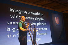 In a 2004 interview with Slashdot, Wales outlined his vision for Wikipedia: "Imagine a world in which every single person on the planet is given free access to the sum of all human knowledge. That's what we're doing."[61] Although his formal designation is board member and chairman emeritus of the Wikimedia Foundation, Wales's social capital within the Wikipedia community has accorded him a status that has been characterized as benevolent dictator, constitutional monarch and spiritual leader.[62][63][64] In two interviews with the Guardian in 2014, Wales elaborated on his role on Wikipedia. In the first interview, he said that while he "has always rejected" the term "benevolent dictator", he does refer to himself as the "constitutional monarch". In the second, he elaborated on his "constitutional monarch" designation, saying that, like Queen of the United Kingdom Elizabeth II, he has no real power.[1][65] He was also the closest the project had to a spokesperson in its early years.[7] The growth and prominence of Wikipedia made Wales an Internet celebrity.[66] Although he had never traveled outside North America prior to the site's founding, his participation in the Wikipedia project has seen him flying internationally on a near-constant basis as its public face.[7][67]