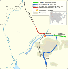 By April 1928, Chiang Kai-shek had once again consolidated power, at which time he resumed the Northern Expedition. The NRA was able to quickly push back the forces of Beiyang-aligned warlord Sun Chuanfang, and advanced into Shandong. Sun retreated to Jinan by railway on 17–18 April, leaving the path to Jinan open to the NRA.[14] When the Japanese learned of Sun's failure to defend Shandong, Prime Minister Tanaka, on the counsel of his military advisors, decided to deploy the 6th Division to Jinan on 19 April, in what was called the "Second Shandong Expedition" (第二山東出兵, Dai-ni Santō Shuppei).[14][15] Whilst Tanaka had misgivings about whether it was prudent to launch the expedition, his party, the Rikken Seiyūkai, had run on a platform of "protecting nationals on the spot" in the February 1928 election, limiting his ability to moderate the Japanese response.[16] Even before Tanaka had given the order, troops under the command of General Fukuda Hikosuke had begun arriving in Jinan via the Qingdao–Jinan railway, possibly as early as 10 April.[14] This was the first serious case of unilateral action by the post-Meiji Restoration Japanese military.[17] The first substantial group of 475 troops, however, arrived in Jinan from Qingdao on 20 April. They were followed by over 4,000 more troops over the coming days. The arrival of the Japanese troops in Jinan, just as the Beiyang-aligned forces had retreated there, prompted suspicions about whether the Beiyang warlords had asked for a Japanese intervention. This was used as propaganda by the Kuomintang, though Beiyang government leader Zhang Zuolin denied doing any such thing.[14][15] Both the Beiyang government and the KMT government in Nanjing protested against the Japanese action, deeming it a violation of Chinese sovereignty.[17]