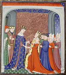 In accordance with the Treaty of Northampton, Joan was married on 17 July 1328 to David, the son and heir of Robert the Bruce, at Berwick-upon-Tweed.[2] She was seven years old and he was four.[3] Their marriage lasted 34 years, but it was childless and apparently loveless.[4]