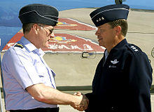 Having been promoted to group captain on 1 January 1990,[13] from 1990 to 1992, Stirrup served as Station Commander of RAF Marham[14] and during his time in command, RAF Marham's strike aircraft were dispatched to the Middle East, seeing action in the Gulf War air campaign.[9] In 1993 Stirrup attended the Royal College of Defence Studies (RCDS).[9] Stirrup was promoted to air commodore on 1 January 1994,[15] and appointed Director of Air Force Plans and Programmes that year.[9] Promoted to air vice-marshal on 1 July 1997,[16] he became Air Officer Commanding No. 1 Group in April 1997, Assistant Chief of the Air Staff in August 1998 and, having been promoted to air marshal on 6 November 2000,[17] he was made Deputy Commander-in-Chief RAF Strike Command that year.[9] His appointment at Strike Command also entailed taking on the additional roles of being the Commander of NATO's Combined Air Operations Centre 9 (based at High Wycombe) and serving as the Director of the European Air Group.[9]
