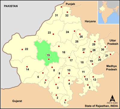 The district is located in the State of Rajasthan in western India. [The district is bounded on the north by Bikaner District, on the northeast by Nagaur District, on the southeast and south by Pali District, on the southwest by Barmer District, and on the west and northwest by Jaisalmer District. The district stretches between 26 00’ and 27 37’ north latitude and between 72 55’ and 73 52’ east longitude. This district is situated at an altitude between 250 and 300 meters above sea level.