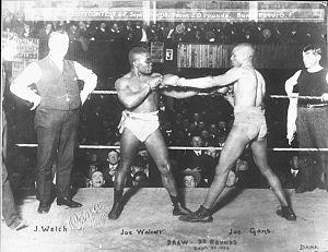 Joe Gans (born Joseph Gant; November 25, 1874 – August 10, 1910) was an American professional boxer. Gans was rated the greatest Lightweight boxer of all-time by boxing historian and Ring Magazine founder, Nat Fleischer. Known as the "Old Master", he became the first African-American World Boxing Champion of the 20th century, reigning continuously as World Lightweight Champion from 1902–1908, having defended the title against 13 boxers.[1] He was inducted into the International Boxing Hall of Fame in 1990.