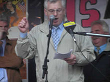 He vowed there would be a nationwide campaign of "people power" against any household and water charges.[55] In September 2011, Higgins committed to facilitating the nomination of Senator David Norris for a place on the ballot paper ahead of the 2011 Irish presidential election, despite multiple controversies enveloping the candidate.[56] On the occasion of the publication of the Keane report on mortgage arrears in October 2011, Higgins criticised Enda Kenny's government and said the report was "a banker's charter written by bankers".[57] His description of allowing the banks to solve their own problems as being "like sending a bunch of marauding foxes that had raided a henhouse back to give mouth-to-mouth resuscitation to their victims" was quoted several times by other commentators in the media.[58][59][60] Higgins addressed "The EU in Crisis" public debate, held at the Ireland Institute in Dublin in October 2011.[61] He served as Ruth Coppinger's election agent in the 2011 Dublin West by-election, held alongside the presidential election.[62] At her campaign launch Higgins said Taoiseach Enda Kenny was engaging in a "cynical manipulation of the political agenda" by delaying the publication of his government's comprehensive spending review until after the elections.[63]
