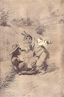 Scholars have questioned his collection of stories, citing the difficulty that many white folklorists had in persuading African Americans to divulge their folklore.[40] But, others note the similarity of African folk stories in several sources that are similar to the Brer Rabbit tales as published, which represent a folk genre. Examples include the Ila language Sulwe mbwakatizha Muzovu ("Hare makes the elephant afraid") in Smith & Dale The Ila-Speaking Peoples of Northern Rhodesia volume 2, page 309.[41] In the totally unrelated Kanuri or Bornuese culture in Northern Nigeria, such tales as a Fable of Jackal and a Hyena[42] display similar themes quite in the Brer Rabbit manner. The difficulties in obtaining printed sources on the African languages may have inhibited these aspects of critical treatment. Some critical scholars cite Uncle Remus as a problematic and contradictory figure: sometimes a mouthpiece for white paternalism, sometimes a stereotype of the black entertainer, and sometimes poetically subversive.[43]