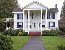 Palmer's brother, named Ephraim like their father, also immigrated to Oregon and served as a captain in the first regiment of the Oregon Infantry.[4] In 1871, Joel was the state's Indian agent to the Siletz tribe, remaining in the office until 1873.[3] All eight of Palmer's children completed higher education.[2] Joel Palmer died in Dayton on June 9, 1881, at the age of 70. His former home that he built in 1852, Palmer House, was added to the National Register of Historic Places in 1987, and is now operating as a restaurant.[14] Palmer's name is one of 158 memorialized in the frieze of the two chambers of the Oregon Legislative Assembly at the Oregon State Capitol, with his located in the Senate chamber.[15] During World War II the liberty ship SS Joel Palmer, hull number 2025, was built and named in his honor.[16] The Oregon Historical Society issues the Joel Palmer Award for the year's best article in its quarterly publication, Oregon Historical Quarterly.[17]