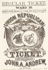 Andrew's popularity made him the choice to head the Massachusetts delegation to the 1860 Republican National Convention.[31] He was nominated for governor at the state convention that year, despite an attempt by the more moderate Governor Banks to secure the nomination for Henry L. Dawes. Banks sought to put off the announcement of his retirement until the last possible moment, but state Republican chairman William Claflin leaked the news to Andrew supporters.[32] Andrew won the nomination by a wide margin, and defeated Constitutional Union Party candidate Amos A. Lawrence in the general election.[33]