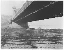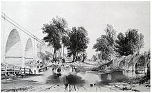 Late 1840s Bourne started working for Charles Blacker Vignoles, who was employed to construct the Nicholas Chain Bridge in Kiev over the Dnieper River.[28] Bourne made the following sketch, which was presented to the Tsar in 1847.[29] The construction of the bridge started in 1848 and was completed in 1855. Bourne made drawings and later weekly photographs of every stage of its construction.