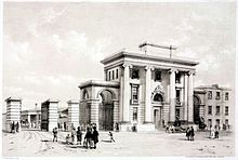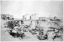 When early 1830s near his home the construction started for the London and Birmingham Railway, the first main-line railway to enter London, this became Bourne's major source of inspiration. In 1836 Bourne started making drawings of the construction sides as subjects of professional study. These drawings were published in 1838/39 in a book in four volumes, with an accompanying text by John Britton. Late 1840 he lithographed some drawings for Robert Hay's publication, entitled Illustration of Cairo. Bourne continued to draw railway scenes, and in the 1840s became associate with Charles Cheffins[5] In 1846[4] He commissioned Bourne to produce a series of drawings about the Great Western Railway, which connected London with the south-west and west of England and most of Wales. This led to the 1846 publication of History of the Great Western Railway. Bourne also draw the illustrations for Bennet Woodcroft's A sketch of the origin and progress of steam navigation from authentic documents. with were lithographed by Cheffins.[6]