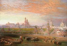 Bourne kept working in Russia as artist in residence for another decade. In the year 1852 he travelled together with Roger Fenton to Moscow and St. Petersburg,[9] which resulted in his painting of the Moscow Kremlin (see image). He stayed in Russia in total for a period of twelve years as illustrator and photographer, before returning to England.