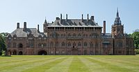 In 1865, the Marquess met William Burges and the two embarked on an architectural partnership, the results of which long outlasted Burges' own death in 1881. Bute's desires and money allied with Burges' fantastical imagination and skill led to the creation of two of the finest examples of the late Victorian era Gothic Revival, Cardiff Castle[8] and Castell Coch.[9] The two buildings represent both the potential of colossal industrial wealth and the desire to escape the scene of that wealth's creation. The theme recurs again and again in the huge outpouring of Bute's patronage, in chapels, castle, abbeys, universities and palaces. Bute's later buildings are hardly less remarkable than his collaborations with Burges. Robert Rowand Anderson rebuilt the Georgian Mount Stuart House for him, and Bute worked in collaboration with many of Burges's colleagues, including William Frame and Horatio Walter Lonsdale, on the interiors. John Kinross was Bute's architect for the sympathetic and creative reworking of the partially ruined Falkland Palace. Kinross also restored Greyfriars in Elgin for Bute.[4]