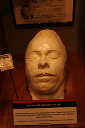 Three men fired the fatal shots: Clarence Hurt fired twice, Charles Winstead fired three times, and Herman Hollis fired once. Dillinger was hit from behind and he fell face first to the ground.[29] Two female bystanders took slight flesh wounds in the legs and buttocks from flying bullet and brick fragments.[25] Dillinger was struck three (or four, according to some historians) times, with two bullets entering the chest; one of them nicked his heart, and the fatal shot - which entered Dillinger through the back of his neck, severed his spinal cord and tore through his brain before exiting out the front of his head just under his right eye. Although three agents shot Dillinger, Winstead was believed to have fired the fatal shot, and he received a personal letter of commendation from Director Hoover.[25] An ambulance was summoned, though it was clear Dillinger had quickly died from his gunshot wounds. At 10:50 p.m. on July 22, 1934, Dillinger was pronounced dead at Alexian Brothers Hospital.[6][29] According to the investigators, Dillinger died without saying a word.[30] There were also reports of people dipping their handkerchiefs and skirts into the blood pool that had formed as Dillinger lay in the alley in order to secure keepsakes of the entire affair.[31] Dillinger's body was displayed to the public at the Cook County morgue after his death.[32]
