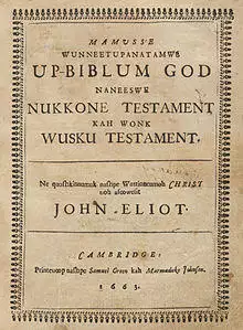 An important part of Eliot's ministry focused on the conversion of Massachusett and other Algonquian Indians. Accordingly, Eliot translated the Bible into the Massachusett language and published it in 1663 as Mamusse Wunneetupanatamwe Up-Biblum God.[16] It was the first complete Bible printed in the Western hemisphere; Stephen Daye printed 1,000 copies on the first printing press in the American colonies.[17]