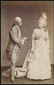 For the next nine years Hare remained a member of the Prince of Wales's company, appearing in a succession of Robertson's comedies and in other plays produced at the theatre. Among his parts were Prince Perovsky (Ours, Robertson, 1866), Sam Gerridge (Caste, Robertson, 1867), Bruce Fanquehere (Play, Robertson, 1868), Beau Farintosh (School, Robertson, 1869), Dunscombe Dunscombe (M. P., Robertson, 1870), Sir John Vesey (Money, Edward Bulwer-Lytton, 1872), and Sir Patrick Lundie (adaptation of Man and Wife, Wilkie Collins, 1873). He also appeared in curtain raisers such as Box and Cox, in which, having played Box in his amateur days, he now played Cox.[n 3] His last part at the Prince of Wales's was in 1874: Sir Peter Teazle in The School for Scandal to the Lady Teazle of Mrs Bancroft, with Bancroft and Charles Coghlan as the Surface brothers. He was praised for rescuing his role from the low comedy treatment it had long suffered, but some thought his portrayal erred in the opposite direction and was too serious.[15]