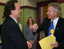 In September 2009, Kitzhaber announced that he would run for a third term as governor,[18] and in May 2010, won the Democratic primary, defeating Roger Obrist and the former Secretary of State of Oregon Bill Bradbury.[19] In the general election, he ran against Republican Chris Dudley and several minor-party candidates, winning in an extremely close election.[20] Their vote percentages were reported as 49.29% and 47.77%.[21][22] Kitzhaber was sworn into his third term as Governor of Oregon on January 10, 2011, succeeding fellow Democrat Ted Kulongoski.