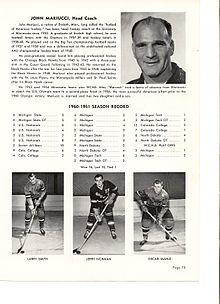 John Mariucci (May 8, 1916 – March 23, 1987) was an American ice hockey player, administrator and coach. Mariucci was born in Eveleth, Minnesota. He attended the University of Minnesota where he played for both the hockey and football teams. He was named an All-American in hockey in 1940. Mariucci was inducted into the inaugural 1973 class of the United States Hockey Hall of Fame and was elected to the Hockey Hall of Fame as a builder in 1985.