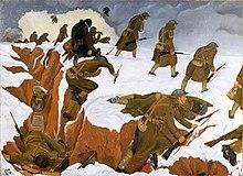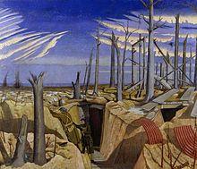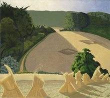 In 1914 Nash began painting in oils with the encouragement of Harold Gilman, whose meticulous craftsmanship influenced his finest landscapes. Nash's most famous painting is Over the Top (oil on canvas, 79.4 x 107.3 cm), now hanging in the Imperial War Museum. It is an image of the counter-attack at Welsh Ridge on 30 December 1917, during which the 1st Battalion Artists' Rifles left their trenches and pushed towards Marcoing near Cambrai. Of the eighty men, sixty-eight were killed or wounded during the first few minutes. Nash was one of the twelve spared by the shell-fire, and painted this picture three months later.[2] The Cornfield, held by the Tate Gallery, was the first painting Nash completed that did not depict the theme of war. The picture with its ordered view of the landscape and geometric treatment of the corn stooks prefigures his brother Paul's Equivalents for the Megaliths. Nash said that he and Paul used to paint for their own pleasure only after six o'clock, when their work as war artists was over for the day. Hence the long shadows cast by the evening sun across the middle of the painting.