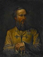 By 1849, Nicholson had spent ten years in India and was entitled to return home for a year's leave. During his time back in Europe, Nicholson served as the best man at his close friend Herbert Edwardes's wedding and travelled throughout Europe extensively.[29] On his return to India in January 1852, Lawrence appointed Nicholson as the new Deputy Commissioner of the largely lawless Bannu area. In this role, Nicholson was ruthless in bringing peace and order to the region with a zero tolerance attitude on crime or any perceived disrespect of British rule, often using flogging or other similar methods to both punish and humiliate any who dared infringe the law.[30] At first, he was feared for his foul temper and authoritarian manner which underpinned his tyrant-style rule, but Nicholson soon gained the respect of the Afghan and North Punjabi tribes in the area for his fairhandedness and sense of honour as well as his almost complete elimination of crime.[31] The respect that Nicholson had first gained from the Sikh people and then the Punjabi tribes became religious worship as the "Nikal Seyn" cult developed, which worshiped Nicholson as a saint-like figure who brought justice to the oppressed by punishing the strong. Amazingly, this cult survived in surprising forms and ways in some remoter parts of North-West Pakistan, into the 21st century.[1][32] Rather than be flattered by this religious devotion, Nicholson found his Christian beliefs offended by the worship and would promptly whip any of the devotees who publicly practiced this cult in his presence.[28] In 1855, at just the age of just thirty-four, Nicholson became the youngest brigadier-general in the Bengal Army.[33] Nicholson was transferred to Peshawar in late 1856 to serve as the District Commissioner.[34]
