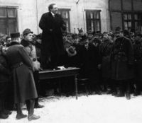 Despite lack of military credentials aside from war reportage, at the time of the collapse of the Austro-Hungarian empire in 1918, Pogány found himself as the leader of the Budapest Soldiers' Soviet.[6] While Pogány dedicated himself to promotion of what one historian has called "the often impossible demands of the soldiers,"[6] he nonetheless remained for a time supportive of the policies of the left-wing government of Count Mihály Károlyi.[1][5]
