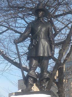 His bronze statue of The Pilgrim, a 9 feet (2.7 m) tall stylized representation of one of the Pilgrims, British immigrants to the New World led by William Bradford who left from Plymouth, England, in the cargo ship Mayflower in September 1620, sits on Pilgrim Hill in Central Park in New York City.[8][9] The statue faces westward on the crest of a little knoll at the top of the hill, on a rusticated Quincy granite pedestal that was created by architect Richard Morris Hunt, overlooking the East Drive at East 72nd Street.[9][10][11][12] The statue was donated to New York City in 1885 by the New England Society of New York.[10][11][8][13]