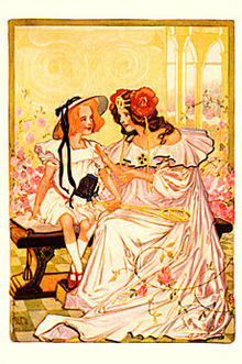 Dorothy drawn by Denslow appeared to be a chubby five- or six-year-old with long brown hair in two thick braids that remained untied at the ends. Neill chose to illustrate a new Dorothy in 1907 when the character was reintroduced in Ozma of Oz. He illustrated the young girl in a more fashionable appearance. She is shown to be about ten years old, dressed in contemporary American fashions, with blonde hair cut in a fashionable bob. A similar modernization was given other female characters.