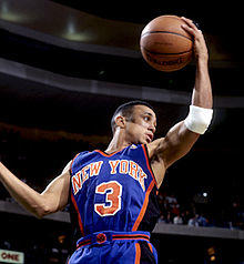 In 1990, Starks tried out for the New York Knicks. In one practice, he tried to dunk on Knicks center Patrick Ewing. Ewing threw him down and Starks twisted his knee. The team was not allowed to release him unless it healed by the end of December. When it did not heal by that time, the Knicks could not release him.[9] As a result, Starks has referred to Ewing as his saving grace. Starks eventually became the starting shooting guard, becoming a key player on the team and playing eight seasons in New York from 1990 to 1998. Starks was a posterchild for their physical play during that era, along with teammates Anthony Mason and Charles Oakley. He was a participant in the 1992 NBA Slam Dunk Contest.