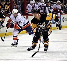 On July 15, 2009, Tavares signed a three-year, entry-level contract with the Islanders.[38] His first NHL game was in the pre-season in a game against the Edmonton Oilers. He spent 22 minutes and 50 seconds on the ice alongside linemates Doug Weight and Sean Bergenheim in the Islanders' 3–2 loss.[39] Weight, a veteran NHLer, said, "John's going to be a big piece of [an Islander rebuilding effort]."[39] Tavares scored his first career NHL goal and assist in his first ever professional game, scoring on a backhander against Marc-André Fleury of the Pittsburgh Penguins on October 3, 2009.[40]