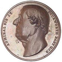 Fighting against France, Duckworth distinguished himself both in European waters and in the Caribbean. He was initially in command of the 74-gun HMS Orion from 1793 and served in the Channel Fleet under Admiral Lord Howe. He was in action at the Glorious First of June.[3] Duckworth was one of few commanders specifically mentioned by Howe for their good conduct, and one of eighteen commanders honoured with the Naval Gold Medal, and the thanks of both Houses of Parliament.[3] He was appointed to command the 74-gun HMS Leviathan in early 1794, and went out to the West Indies where he served under Rear-Admiral Sir William Parker. He was appointed commodore at Santo Domingo in August 1796. In 1798 Duckworth was in command of a small squadron of four vessels.[a] He sailed for Minorca on 19 October 1798,[5][6] where he was a joint commander with Sir Charles Stuart, initially landing his 800 troops in the bay of Addaya,[7] and later landing sailors and marines from his ships, which included HMS Cormorant and HMS Aurora, to support the Army. He was promoted to rear-admiral of the white on 14 February 1799 following Minorca's capture, and "Minorca" was later inscribed on his coat of arms. In June his squadron of four ships captured Courageux.[8]
