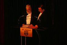 The term raspberry is used in its irreverent sense, as in "blowing a raspberry".[9] Wilson commented to the author of Blame It on the Dog: "When I registered the term with the Library of Congress in 1980, they asked me, 'Why raspberry? What's the significance of that?' But since then, razz has pretty much permeated the culture. We couldn't have done it without Hollywood's help."[9] Wilson is referred to as "Ye Olde Head Razzberry".[10] The ceremony's program is modeled after the Academy Awards, but is "deliberately low-end and tacky".[7] The awards themselves typically cost US$4.79 each, in the form of a "golfball-sized raspberry" which sits atop a Super 8 mm film reel; the whole of which is spray-painted gold.[9][11][12]