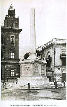 Holwell was a survivor of the Black Hole of Calcutta, June 1756, the incident in which British subjects and others were crammed into a small poorly ventilated chamber overnight, with many deaths. Howell's account of this incident (1758) obtained wide circulation in England and some claim this gained support for the East India Company's conquest of India. His account of the incident was not publicly questioned during his lifetime nor for more than a century after his death. However, in recent years, his version of the event has been called into question by many historians.[1][2][3]
