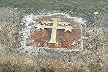 A statue of Saint John of Nepomuk has often been erected on bridges in many countries, such as on the Ponte Milvio in Rome. The one in Prague was extremely popular as late as the 19th Century, when people traveled from Tyrol, Hungary, and particularly Bohemia to Prague to celebrate his feast day, May 16.[14] There is a white statue of St. John of Nepomuk in the small village of Divina, in Slovakia.[15] There is also a commemorative plaque on a bridge leading out of Obergurgl, Austria depicting Nepomuk holding a finger to his lips, as if protecting a secret.