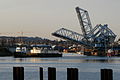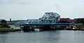 Construction of a rolling bascule bridge beside the third bridge began in 2013, and opened to the public on March 31, 2018.[29] [30] As of December 31, 2017, actual costs of $96.08 million had been incurred, to an approved budget of $105.06 million. [31] The bridge affords a three-lane roadway, a pedestrian walkway on the south side, and a multi-use pathway on the north side.