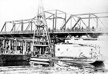 A low wagon bridge was completed in 1855, which blocked marine traffic. It was dismantled in 1862 and was replaced with a ferry service.