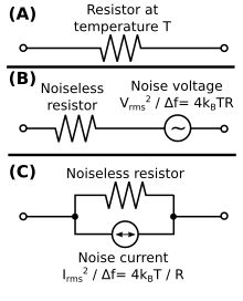 where Δf is the bandwidth in hertz over which the noise is measured. For a 1 kΩ resistor at room temperature and a 10 kHz bandwidth, the RMS noise voltage is 400 nV.[6] A useful rule of thumb to remember is that 50 Ω at 1 Hz bandwidth correspond to 1 nV noise at room temperature.