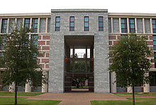 Wiess Hall was completed in 1949, but carried the name "North Hall" until its dedication in March 1950.[40] It was laid out as a W-shaped building, with three north–south wings, joined on the north ends by a long east–west spine, forming two open quadrangles.[41] The building was two stories high except for the three-story center wing. The hall was designed to house about 200 students in 20 single and 90 double rooms. Each room at Wiess opened directly to an exterior walkway that wrapped around the entire building. This design incorporated two features that were innovative at the time: every room had a semi-private bathroom and every room (except room 228, which was reserved for freshmen) had windows on at least two sides—an important adaptation in the years before air conditioning.[42]