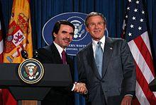 He actively encouraged and supported the Bush administration's foreign policy and the US invasion of Iraq in 2003.[9] He defended it on the basis of secret intelligence allegedly containing evidence of the Iraqi government's nuclear proliferation. On 30 January 2003, Aznar signed The letter of the eight supporting US. policy on Iraq.[10] The majority of the Spanish population, including some PP members, were against the war. Spain's major cities were the scene of the largest street demonstrations ever seen in the country as a result of the government's participation in the invasion. Aznar lost some support from those who had voted for the PP in 2000. On a live TV interview aired on the public station while demonstrations were taking place on the streets, he asked the Spanish people to take his word assuring there were weapons of mass destruction in Iraq, of which he had evidence. This is now regarded as incorrect.[11][12]